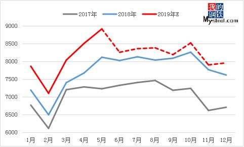 圖3:2017-2019年全國粗鋼月產量(單位:萬噸)